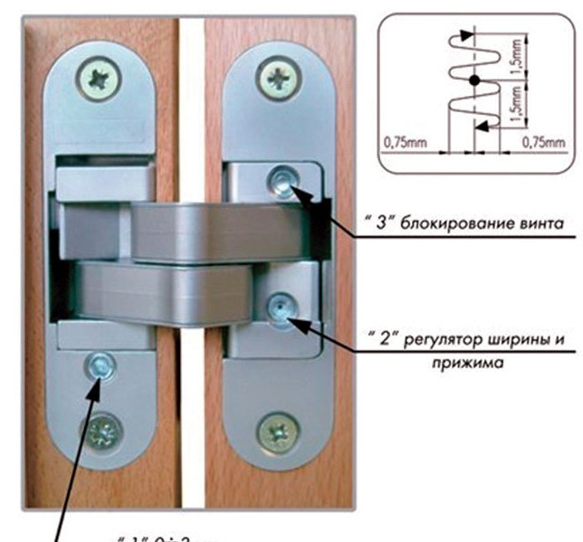 Наиболее удобны в регулировке скрытые дверные петли. В них установлены три винта. Каждый корректирует один из параметров: высоту, ширину посадки дверного полотна, а также прилегание. Регулировка производится шестигранником, который обычно поставляется вместе с петлями и имеет форму буквы «Г». Нежелательное отклонение полотна от нормативного положения убирается вращением регулирующих винтов.