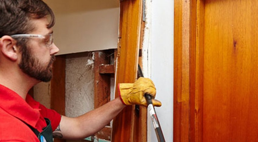 - Подготовка проёма двери. Если монтаж производится в эксплуатируемом здании и необходимо удалить старую дверь, следует провести полный демонтаж последней, включая дверное полотно, раму и средства крепления. Освободившийся проём необходимо зачистить от старой штукатурки, минеральной ваты, служившей утеплителем, остатков монтажной пены и т. д.