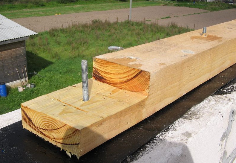Крепление мауэрлата к бетонной стене производится при помощи шпилек, замурованных в неё на этапе заливки армопояса
