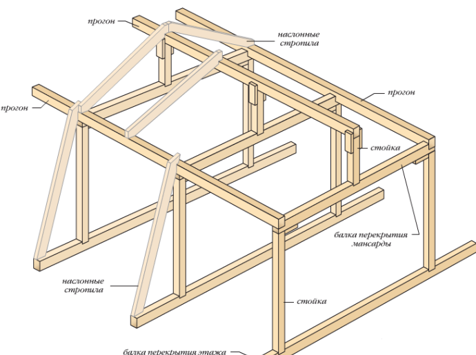 Каркас мансардной крыши состоит из стропильных ферм, соединённых коньковой балкой в верхней части