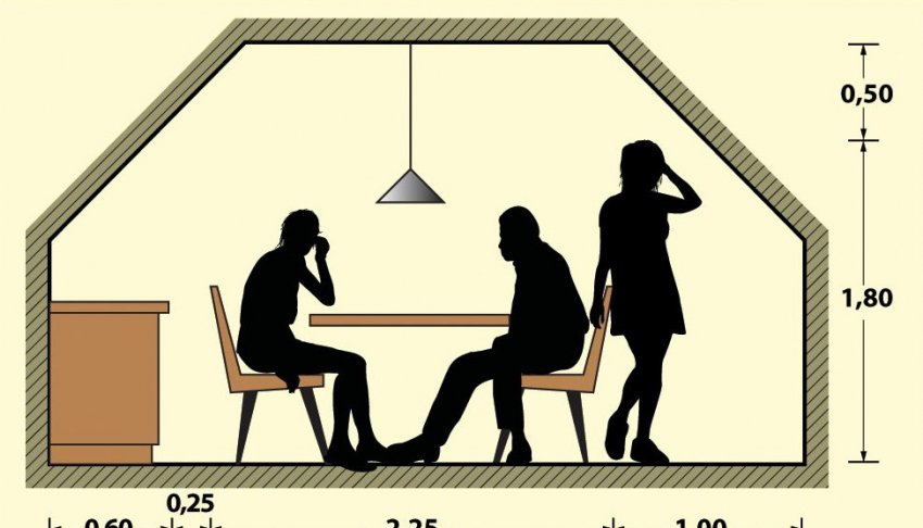 В соответствии со СНиП расстояние от пола до потолка должно составлять не менее 250 см. При проектировании мансардных крыш необходимо учитывать соотношение размеров реальной и полезной площади помещения. В связи с этим при вычислении площади мансарды учитываются её части со следующими параметрами:
