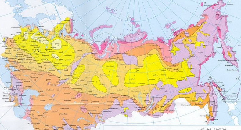 Территория России делится на врсемь основных зон, каждая из которых характеризуется соответствующей величиной ветровой нагрузки