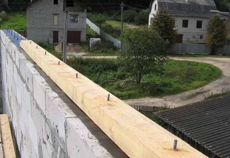 Для крепления мауэрлата к стене из бетонных блоков используются шпильки, вмурованные в кладку на этапе заливки армопояса
