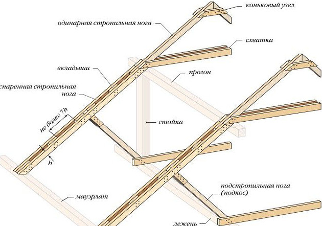 - Справа и слева на него опирают боковые стропила, подошва которых устанавливается на мауэрлат.