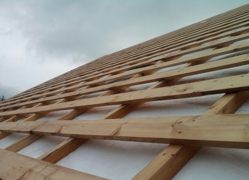 Контробрешётка набивается вдоль стропил для формирования вентиляционного зазора, а затем на неё укладывается обрешётка под кровельное покрытие