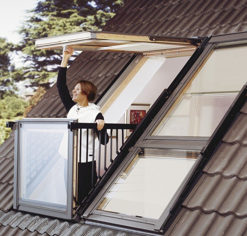 Сегодня ломаные мансардные крыши всё чаще оборудуют новейшей разновидностью балкона — балконом-окном. В сложенном виде такая конструкция представляет собой окно, состоящее из двух стыкующихся по горизонтальной линии частей. Если же обе части выдвинуть вперёд, окно превращается в балкон с козырьком.