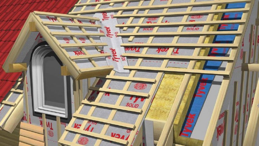 - Стропила застилаются гидроизоляционной плёнкой, которая фиксируется контробрешёткой (доски, набиваемые сверху на стропила параллельно им).