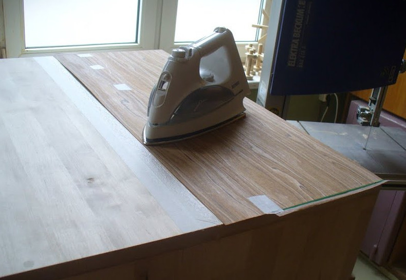- Во избежание появления дефектов в местах стыков начинать оклеивание нужно с небольших полосок шпона (30–40 мм). Если на высохшей конструкции щель не появилась, то можно приступать к основному этапу.