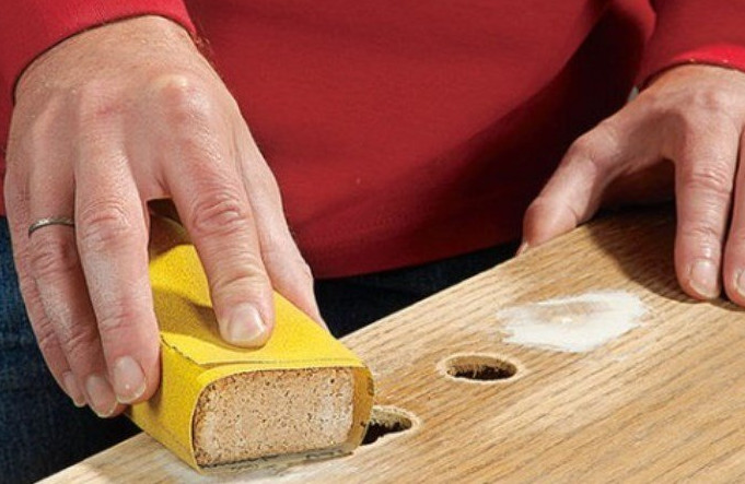 - Выравнивание основания. Избавиться от мелких трещин и впадин поможет шпатлёвка по дереву и шпатель. После полного высыхания раствора рекомендуется снова зачистить поверхность.
