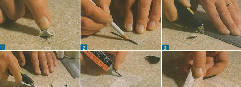 - Места дефектов вырезаются в виде окошечек, по размерам которых готовятся куски покрытия. Заплатка должна укладываться так, чтобы на фоне дверей её не было заметно. Разрезать материал лучше скальпелем и поперёк волокон во избежание расщепления дерева.
