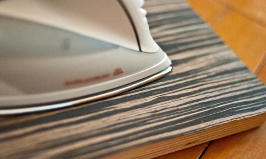 - Устранение вздутия материала. Основная причина такого повреждения — нарушение технологии наклеивания листов шпона. Своевременный ремонт поможет избежать растрескивания полотна. Вздувшаяся поверхность может быть обработана несколькими способами. Во-первых, для выравнивания покрытия достаточно приложить на несколько секунд горячий утюг. Во-вторых, для восстановления эластичности материала допускается использование влажной ветоши. В-третьих, внутрь пузырька можно залить клей.