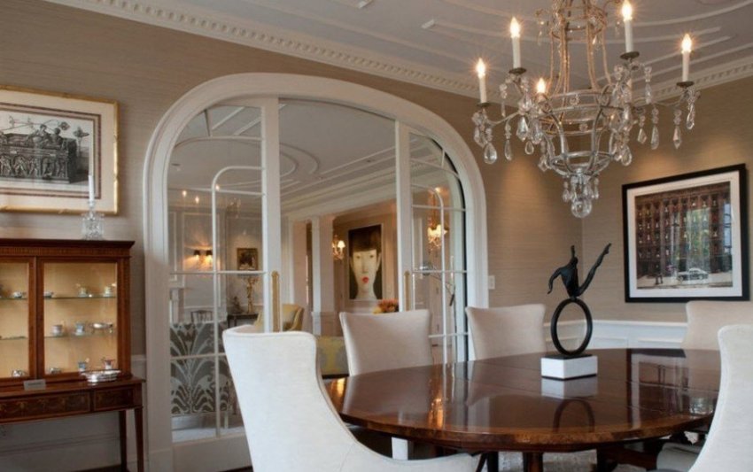 Чтобы вписать межкомнатную стеклянную дверь в стили ампир, модерн, неоклассика, дизайнерам приходится дополнять полотна из стекла деревянными, металлическими фигурными переплётами, характерными надстройками над дверью, рисунками или гравировками на стекле.