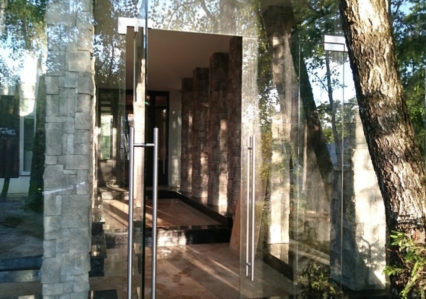 Стили хай-тек, техно, минимализм, эклектика не ограничивают использование стеклянных дверей. Если на фасадах домов в стиле ампир или модерн стеклянные входные группы выглядят чужеродным телом, то современные здания с зеркальной или стеклянной фасадной стеной трудно представить с другим входом. В то же время большие стеклянные полотна хорошо сочетаются с диким камнем, гранитом, мрамором, природной зеленью, что активно используют архитекторы общественных зданий и загородных домов.