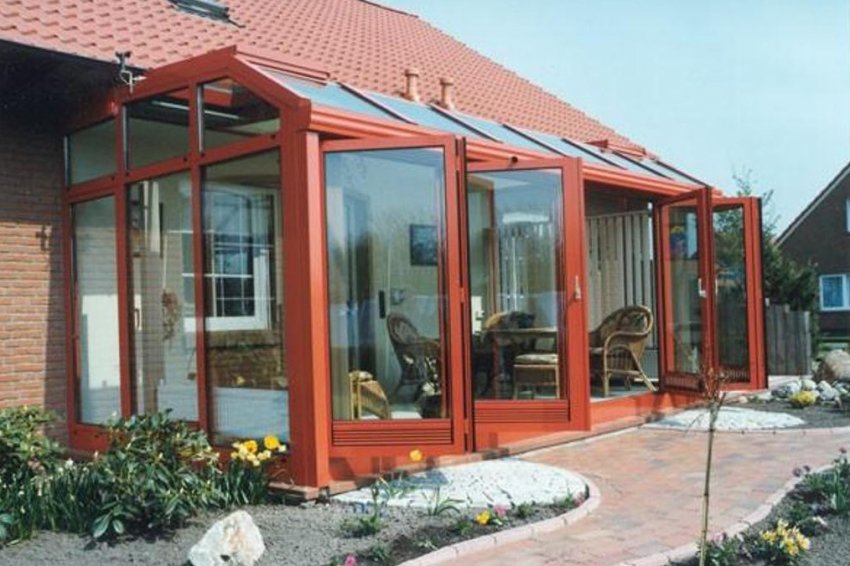 Складная конструкция двери, выходящая на террасу, по цвету переплета может гармонировать с кирпичом облицовки, садовыми дорожками