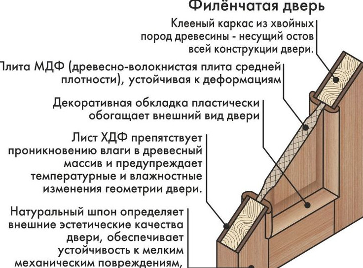 Дверная рама — обвязочный каркас — обычно выполняется из массива дерева или клеёного бруса. Боковые и поперечные детали каркаса соединяются при помощи деревянных шипов. Филёнки, выполняющие декоративную функцию, крепятся к двери двумя способами: