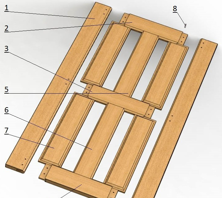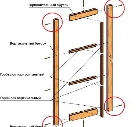 - Начинаем сборку дверной конструкции: к одной из вертикальных стоек прикрепите поперечные перекладины и филёнки, а затем установите вторую стойку.