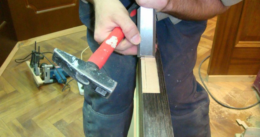 При помощи стамески вырезаем проёмы для петель в торце двери и закрепляем их саморезами