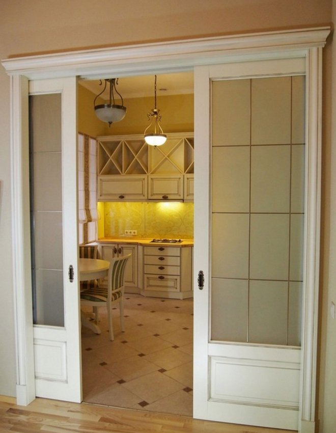 Для кухни и гостиной часто подбирают филёнчатые двери с матовым стеклом