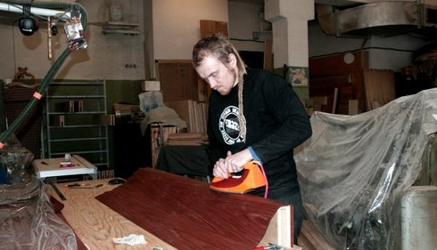 - После высыхания обработайте повторно наждачной бумагой. Шпон вырезают по размеру основы. На полотно и шпон наносят столярный клей, дают подсохнуть. Затем максимально аккуратно, разглаживая, крепят лист шпона и по всей поверхности проводят утюгом, нагретым до средней температуры. На торцы точно так же крепят кромочную ленту.