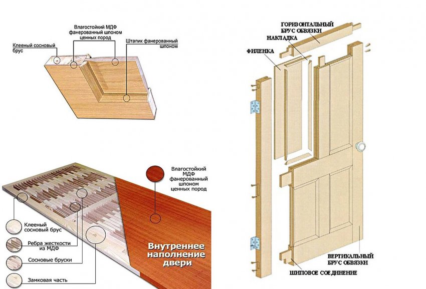 Конструкция предполагает каркас, в который устанавливают филёнки разной формы и величины. Полотно получается глухим, украшается фигурными деталями. В замковой области каркас усилен, что необходимо для надёжности дверной ручки и замка.