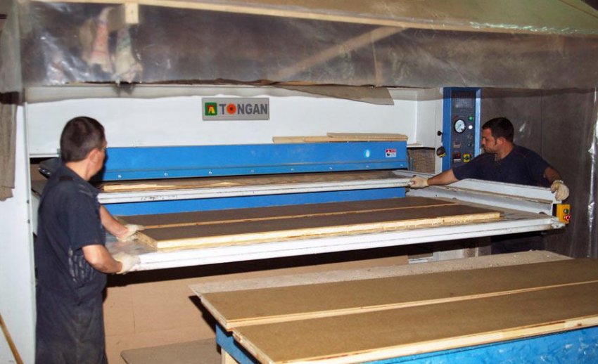 Сложное оборудование по изготовлению шпонированных дверей работает в конвеерном режиме и обслуживается специалистами