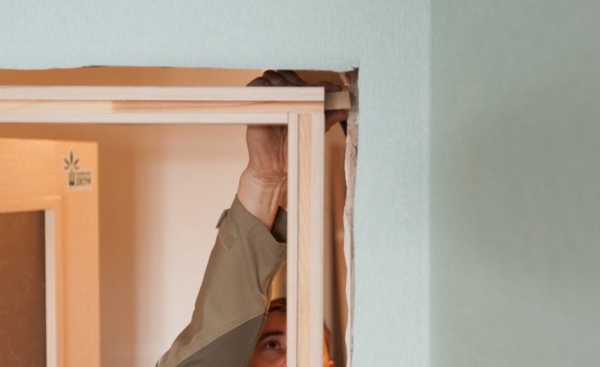 - Дверной короб собирается, устанавливается в проём и выравнивается путём фиксации клиньями. Ровность проверяют угольником и строительным уровнем.