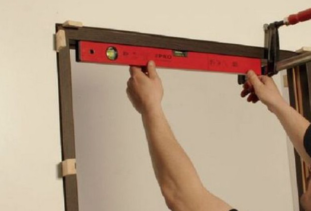 Выровняйте дверную коробку по горизонтали и вертикали, применяя уровень