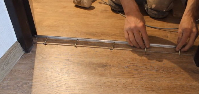 Порожек фиксируется к полу при помощи дюбелей и саморезов