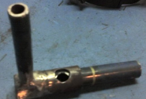 - Для подключения печи к дымоходу в отверстие крышки ввариваем отвод диаметром 110–120 мм с углом поворота 90 градусов. К нему присоединяется горизонтальный участок длиной 0,8–1 м (так называемый боров). Он задерживает выход газов из камеры дожигания, позволяя им сгореть в полном объёме.