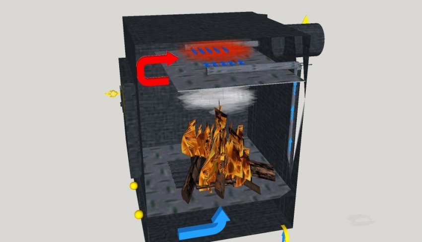 Принудительная тяга направляет газы во вторую часть печи, где происходит их дожиг (с выделением большого количества тепла)