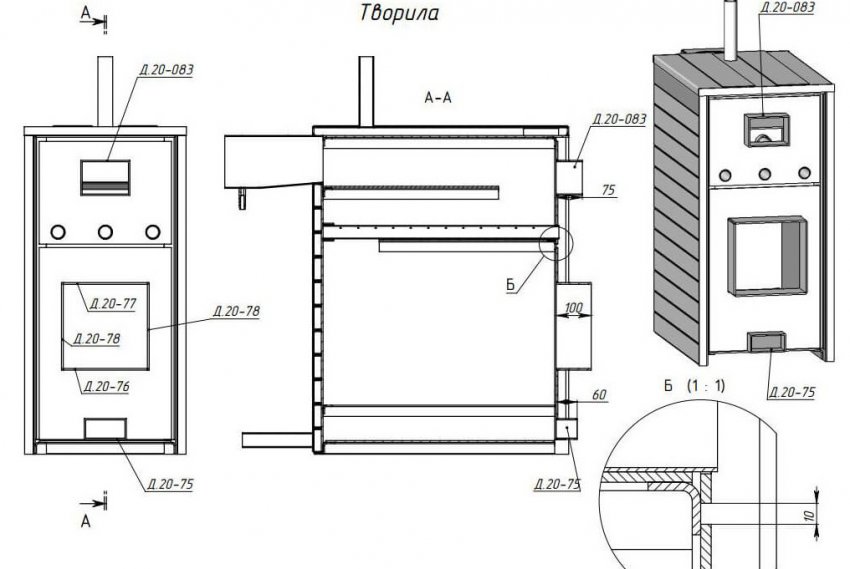 Обязательным этапом является создание чертежа или схемы будущей конструкции. Для этого нужно определить форму и размеры корпуса, вариант расположения камер. После этого проводится расчёт мощности, достаточной для обогрева помещения. Параметры определяют следующим образом: