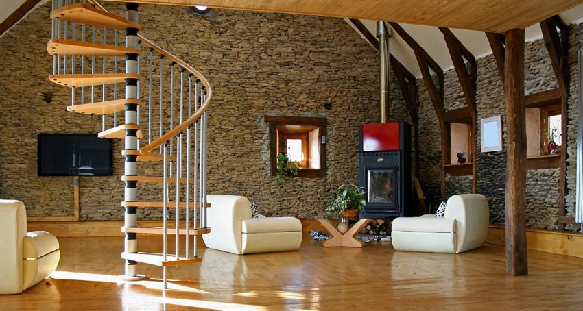 Отделка стен мансарды может имитировать натуральный камень, такое решение будет выглядеть довольно стильно