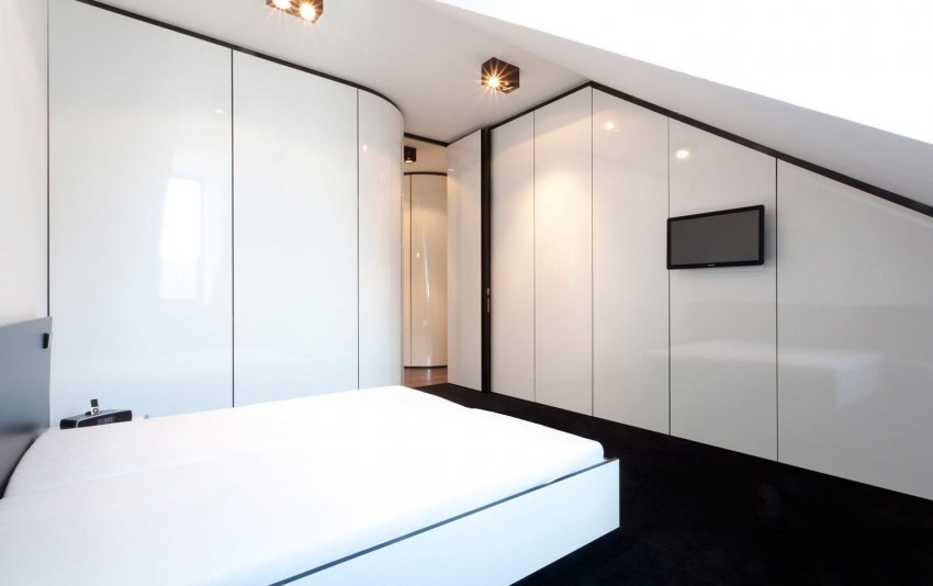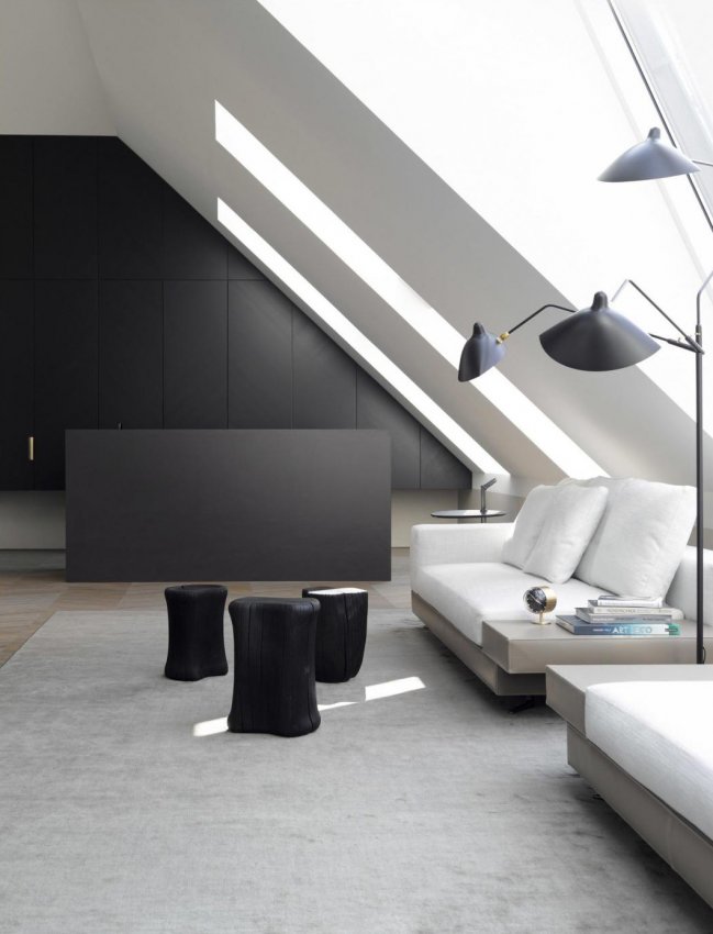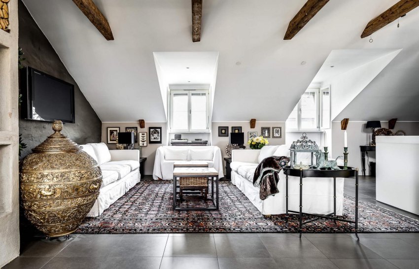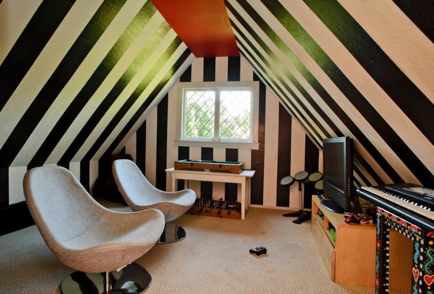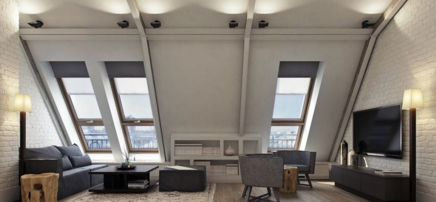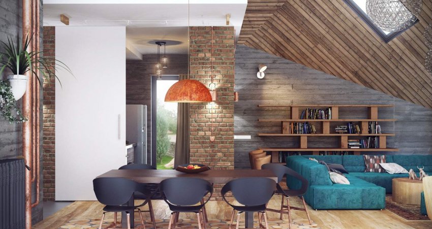 Также считается, что в комбинированном интерьере должны быть глянцевые материалы. Поскольку для мансарды очень важно расширить пространство вверх, глянец может размещаться только на скатах.