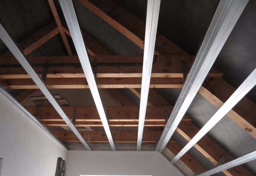 Недостатком гипсокартона в мансарде оказывается его низкая эластичность — когда дерево «играет», ГКЛ не способен последовать за ним. Поэтому такие методы, как приклеивание листа к основе или крепление на саморезы к стене с одновременной регулировкой положения под крышей неприменимы. Нужна прочная стальная обрешётка, которая будет крепиться к дереву металлическими подвесами, способными компенсировать движение стропил.