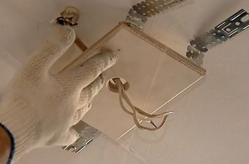 Закладная для люстры крепится на металлические стойки при помощи саморезов