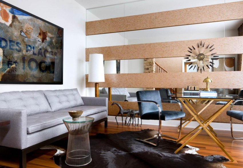 - зеркала из просветлённого (без зелени), обычного, бронзового или графитового стекла (возле таких стен можно смело устанавливать мебель и вешать на них картины, это поможет избежать «передозировки» отражений);