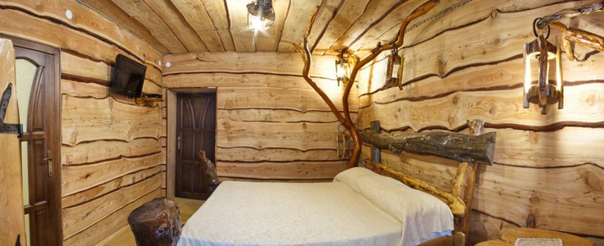 - «антипаркет» — обрезки брусков раскалываются топориком по длине и крепятся гладкой стороной к стене, фактурой наружу (понадобится удалить самые острые опасные выступы, но результат того стоит);