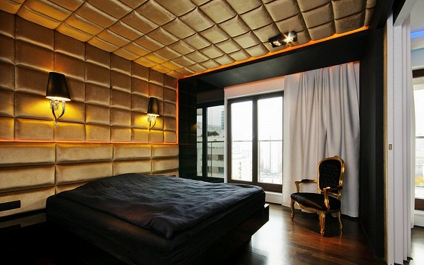 - оббив стену поролоном и задрапировав тканью, подходящей или контрастной к мягкой мебели/покрывалу кровати (это дешевле и можно сделать самостоятельно);