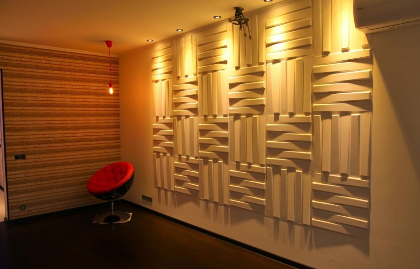 Чтобы придать интерьеру мансарды изюминку, можно также использовать панели с трёхмерным рисунком. Наиболее распространены гипсовые, но они тяжёлые и требуют стабильной основы. Поэтому лучше купить панели из тонкого пластика или лёгкие акустические «плиточки». Оба варианта смотрятся очень привлекательно и современно.
