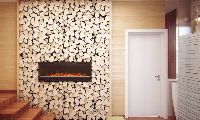 Ещё один бюджетный вариант — сделать из обрезков неглубокие полочки и уложить в них колотые дрова. Если стена зашита только мембраной, перед этим желательно затянуть её дешёвой тканью или агроволокном, чтобы создать красивый фон для брёвнышек.