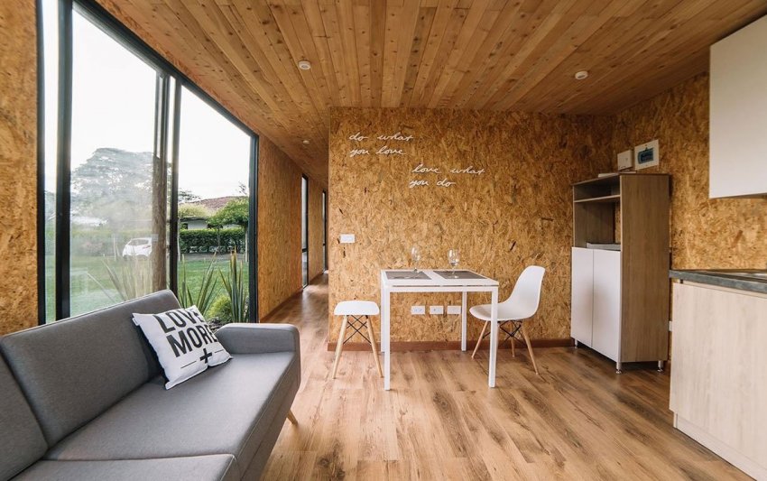 Украшенная надписями стена из ОСБ смотрится очень современно