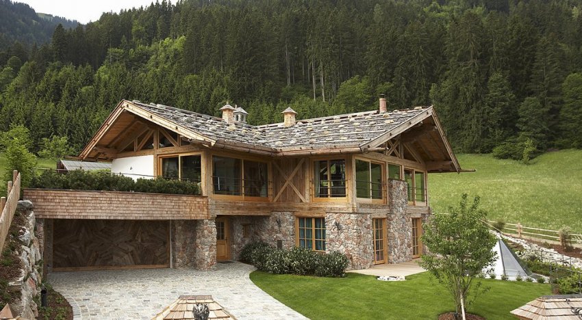 Контрастная отделка подразумевает использование разных материалов для этажей дома, например, снизу — камень, сверху — дерево