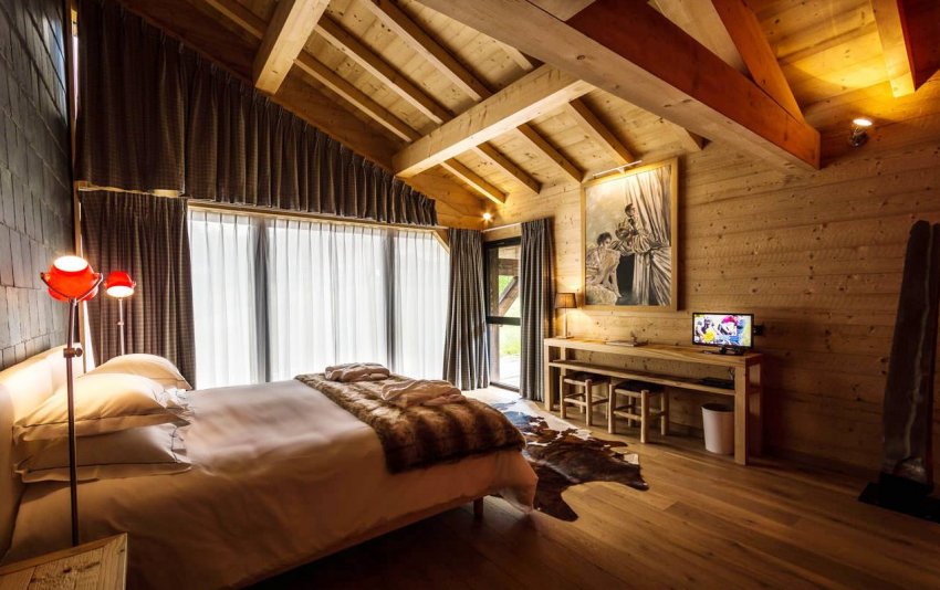Большие окна и яркие светильники придают тотально деревянной мансарде современные черты