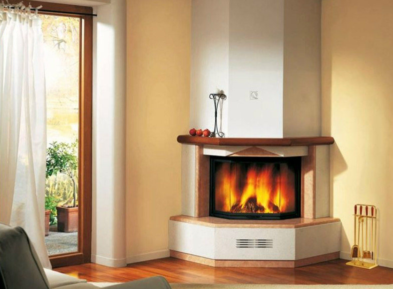 - Угловое: к этому способу прибегают в том случае, если помещение имеет скромные размеры. Угол обычно является наименее востребованной зоной, так что установка здесь фальшкамина почти не сказывается на количестве свободного пространства. Угловой портал будет иметь уже не прямоугольное, а треугольное основание.