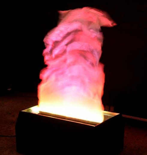 - Более дорогое решение: имеется ультразвуковой парогенератор, такой же, как в увлажнителях воздуха (производит холодный пар или туман), а под ним — подсветка из разноцветных светодиодов, которые бросают на туман мерцающие блики. Дополнительно для большего сходства устанавливается система аудиовоспроизведения, транслирующая характерный звукоряд — шипение и потрескивание дров.