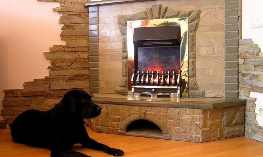 Столешница для пристенного камина имеет форму прямоугольника, для углового — пятиугольника. По размерам она должна на несколько сантиметров превосходить габариты портала. В качестве боковых стенок вокруг постамента устанавливают плинтус одного со столешницей цвета.