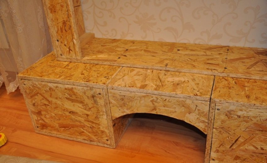 В роли постамента выступает столешница, уложенная на раму из металлического профиля высотой около 50 мм. Столешницу можно сделать из различных материалов: