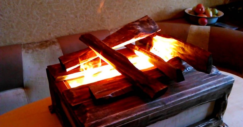 - Самый простой и дешёвый: к пластиковым псевдополеньям прикрепляют несколько полос красного шёлка, а снизу устанавливают подсветку и вентилятор. Свет от лампы напоминает жар углей, при этом шёлковые полоски трепещут в нагнетаемом вентилятором воздушном потоке, имитирует языки пламени. Попутно воздух обдувает ТЭН, имеющийся в верхней части очага, и распространяет таким образом тепло.