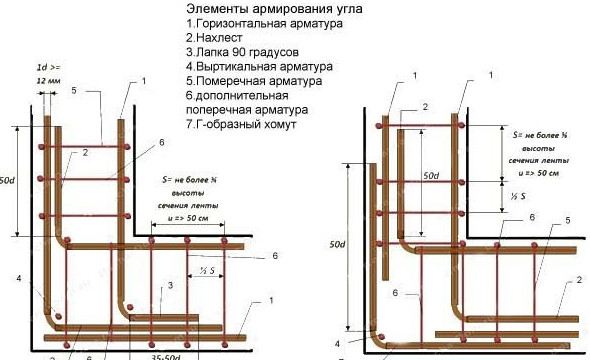 - В углах следует укладывать согнутые под прямым углом, то есть Г-образные, стержни с длиной каждой ветви не менее 30 см. Укладка в этом месте пересекающихся прямых стержней не допускается, так как ленты армопояса в таком случае не будут жёстко связаны друг с другом. То же самое относится и к местам, где имеется Т-образное пересечение лент армопояса на внутренней и наружной стенах.