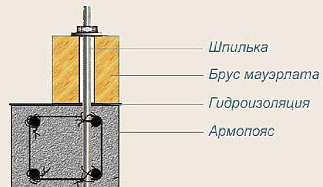 Для фиксации мауэрлата армопояс нужно оснастить закладными деталями — шпильками диаметром 12 мм. До заливки бетона шпильки привязываются к арматурному каркасу, причём на каждую из них снизу должна быть навинчена гайка — она не даст вырвать крепёжный элемент из бетона. Длина шпильки должна быть такой, чтобы верхняя её часть выступала из мауэрлата на 40–50 мм. В каждом межстропильном пространстве должна быть хотя бы одна шпилька, оптимальным же считается шаг в 1 м.